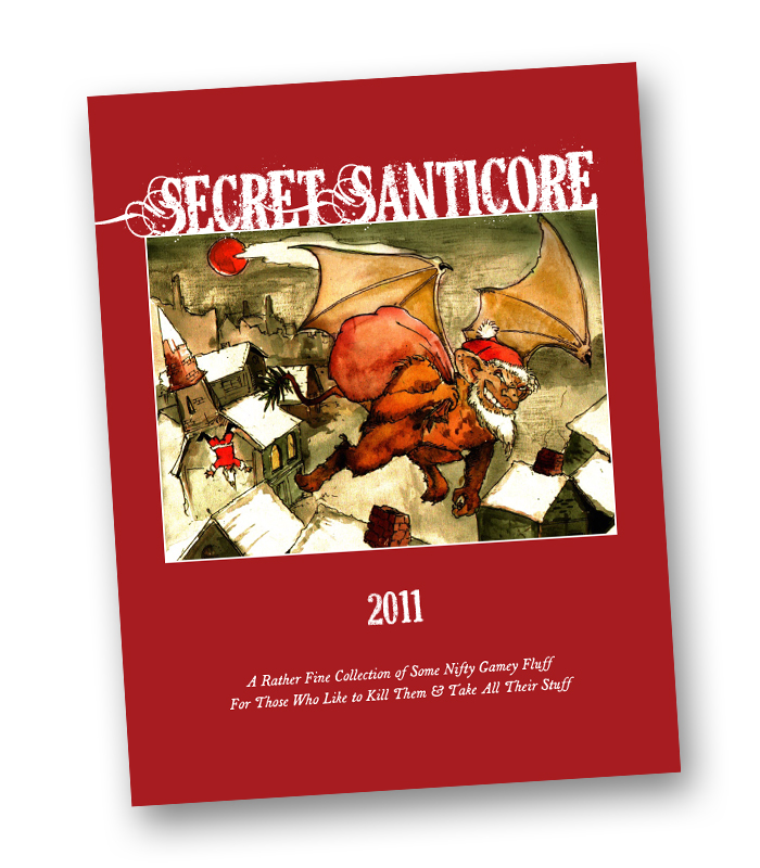 Here it is... in all its warty, unwashed, typo-riddled glory: Secret Santicore 2011! 104 pages of generous creativity for your game, and it's all totally free. Not a cent.